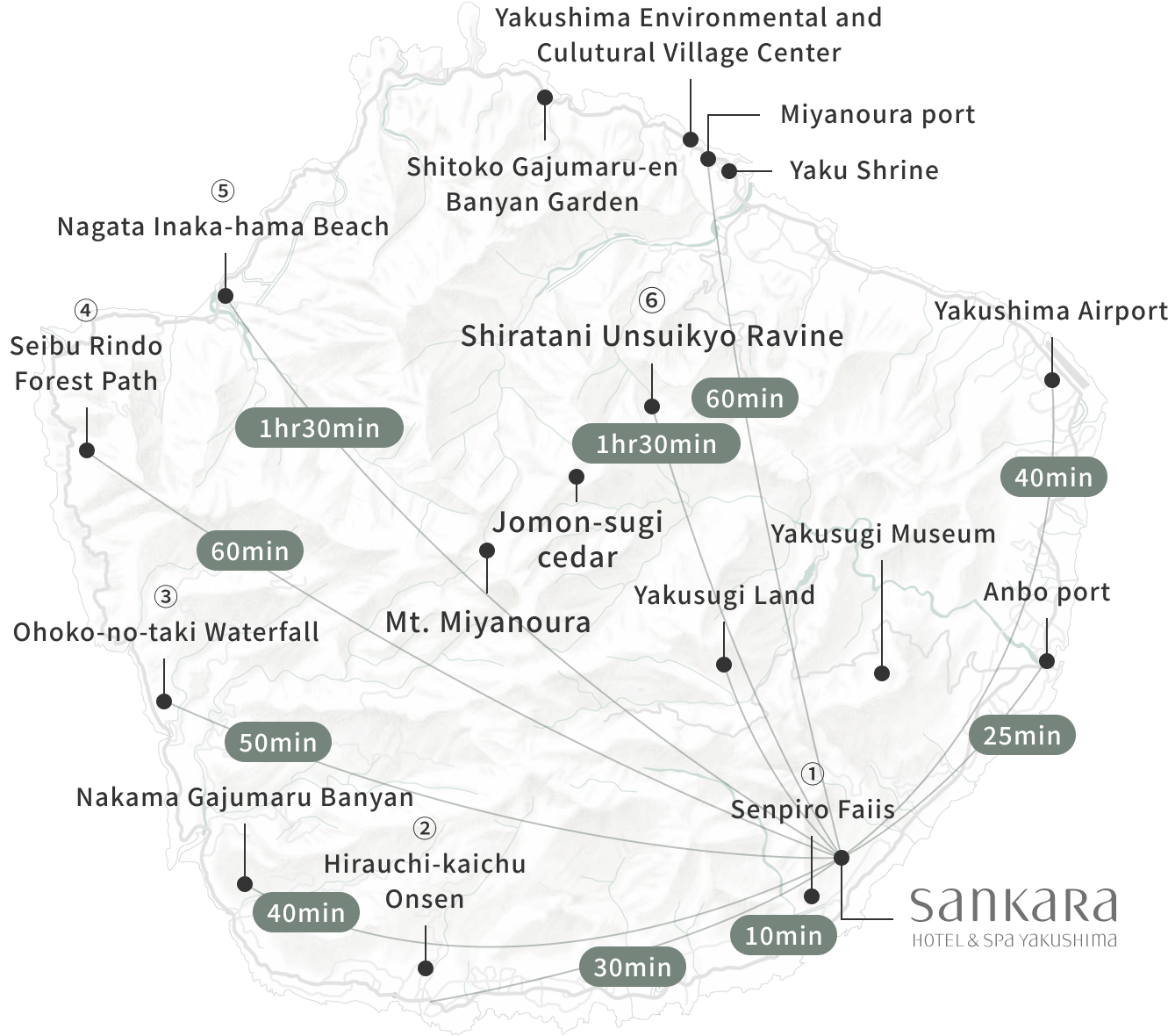A complimentary pickup service is available from Yakushima Airport in time with your arrival and departure. Travel time from the airport to Sankara is about 40 minutes.