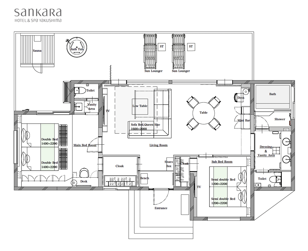 - Water server with Yakushima water, Yakushima fruit juice (canned), bottled beer, pool bags, hooded sweaters, THANN shower products (shampoo, conditioner and body soap), Sankara signature skincare set, body milk, shaving gel, cotton pads, cotton buds, hair bands, sheet masks, toothbrushes, shavers, hair brushes, hair dryer, pajamas, bathrobes, slippers, outdoor sandals, magnifying glass, drip coffee, herbal tea, cold brew tea, snacks, Nespresso coffee machine, safe, deodorizing spray, clothes brush