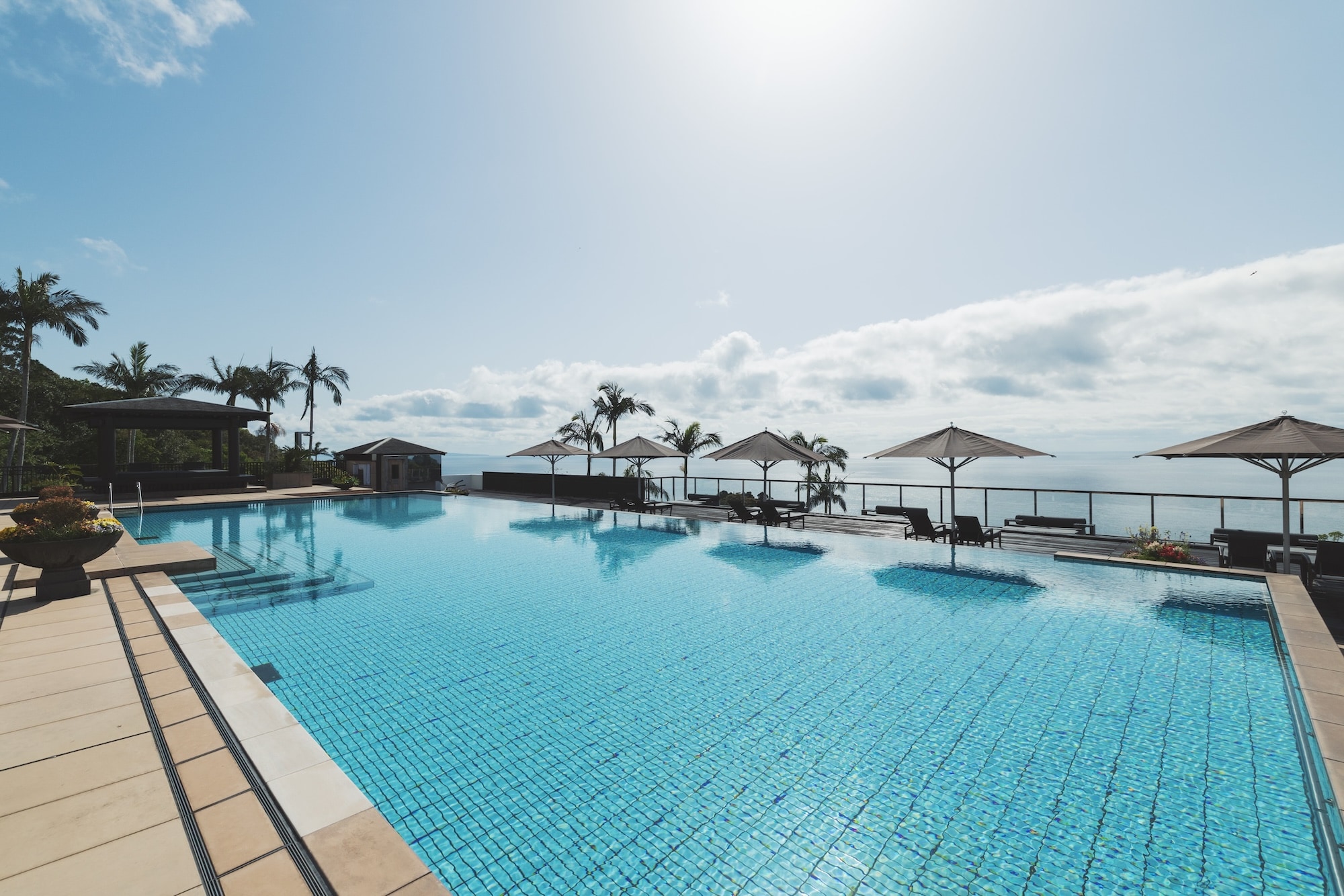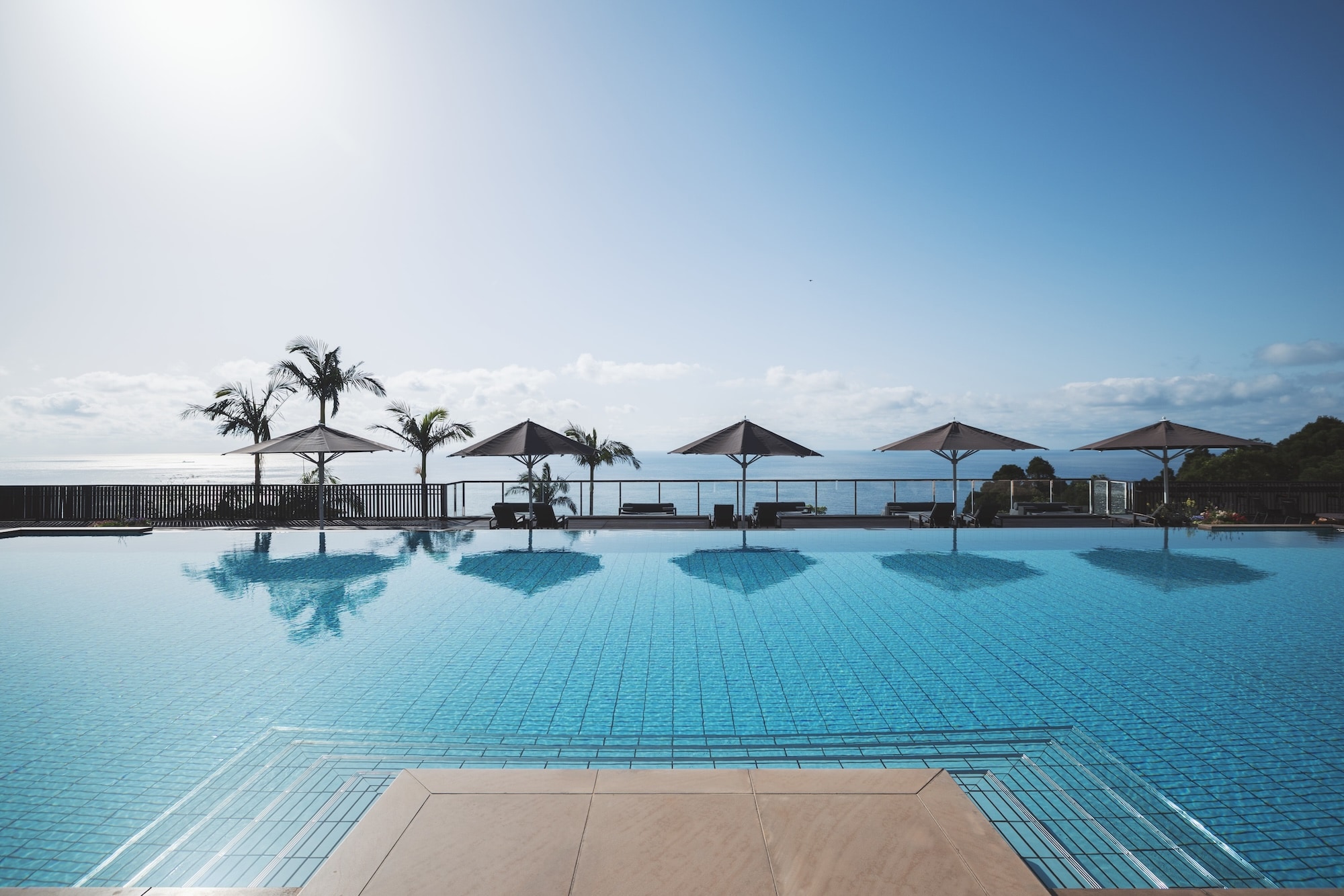 sankara hotel & spa 屋久島を象徴するインフィニティプール。高台から海を見晴らすプールで過ごすひとときはラグジュアリーそのもの。隠れた朝日の名スポットでもあります。また、プールサイドデッキでドリンクや軽いお食事をお楽しみいただけます。