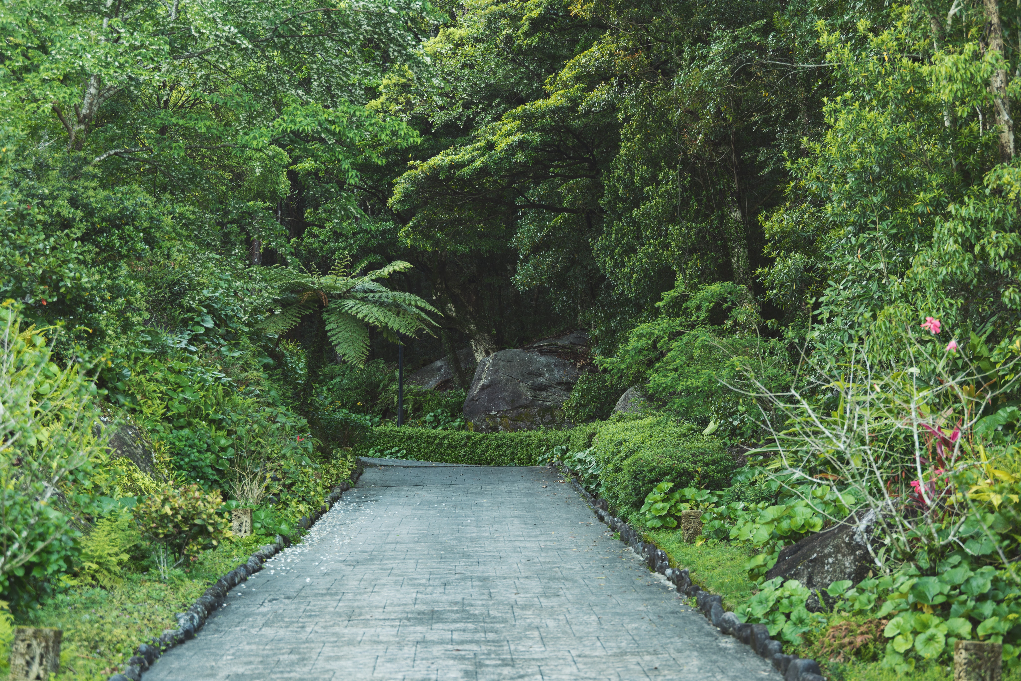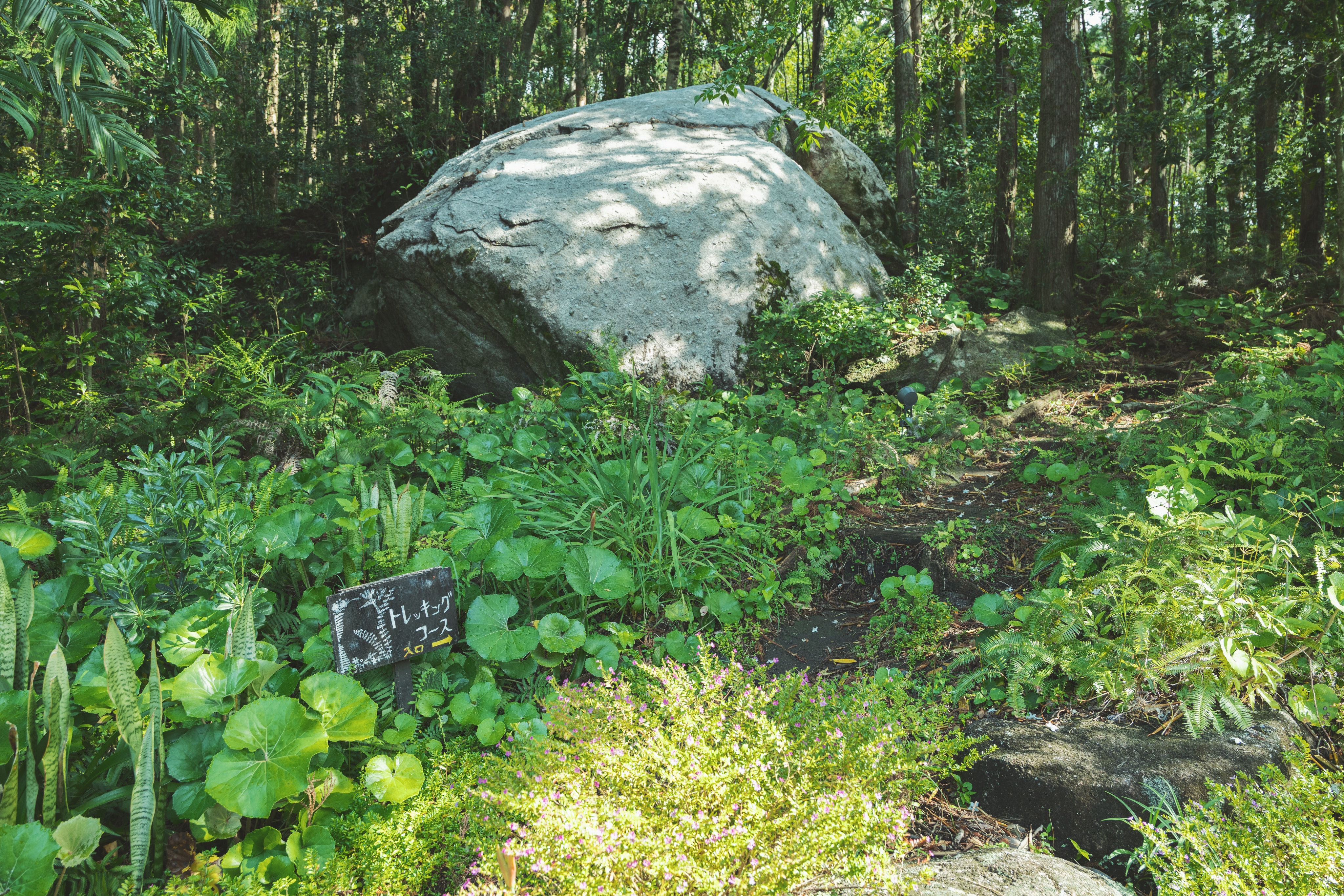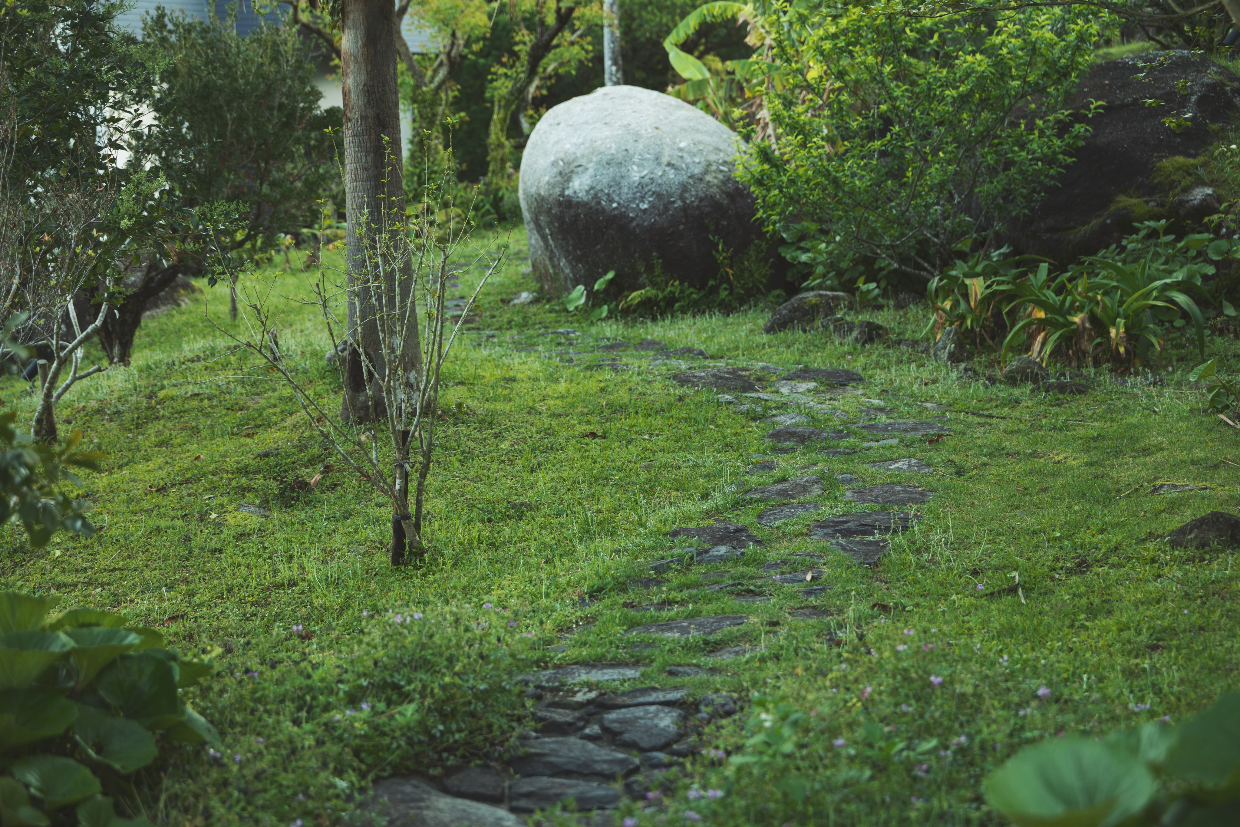 敷地内には南国特有の植物が群生し、まるで天然の熱帯植物園のような景観が広がります。存在感のある花崗岩の巨岩は屋久島のダイナミズムの象徴そのもの。ヴィラが点在するガーデン内の散策路では、鳥のさえずりや風の音に包まれながら、四季折々の植物を楽しむことができます。