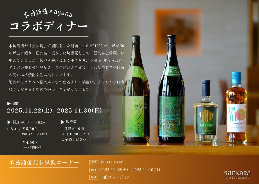 いつも好評いただいています『屋久島伝承蔵 本坊酒造』×ayanaコラボレーションディナーを 2025年11月22日~11月30日 に開催します。本坊酒造の焼酎やウィスキー等に、料理を合わせたペアリングが特徴です。